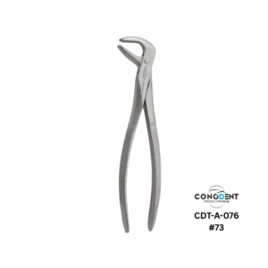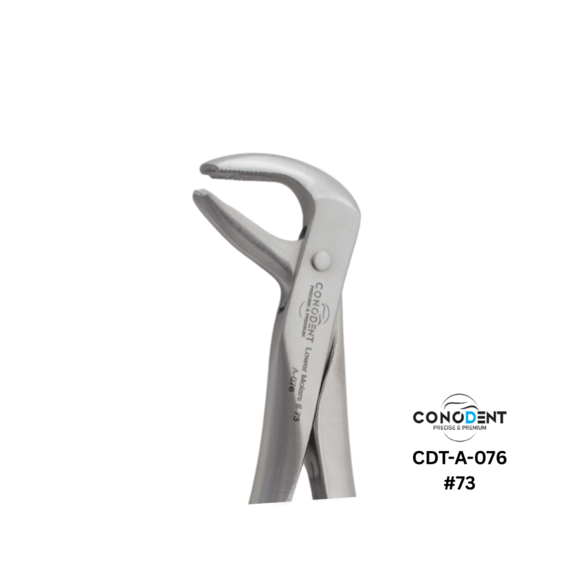 The Conodent Figure 73 Extraction Forceps, commonly referred to as the “Hawks Bill,” are a staple instrument for the removal of mandibular (lower) molars. This model features the traditional English Pattern handle with a high-performance matt finish, designed to reduce glare and provide superior grip during intensive surgical procedures.