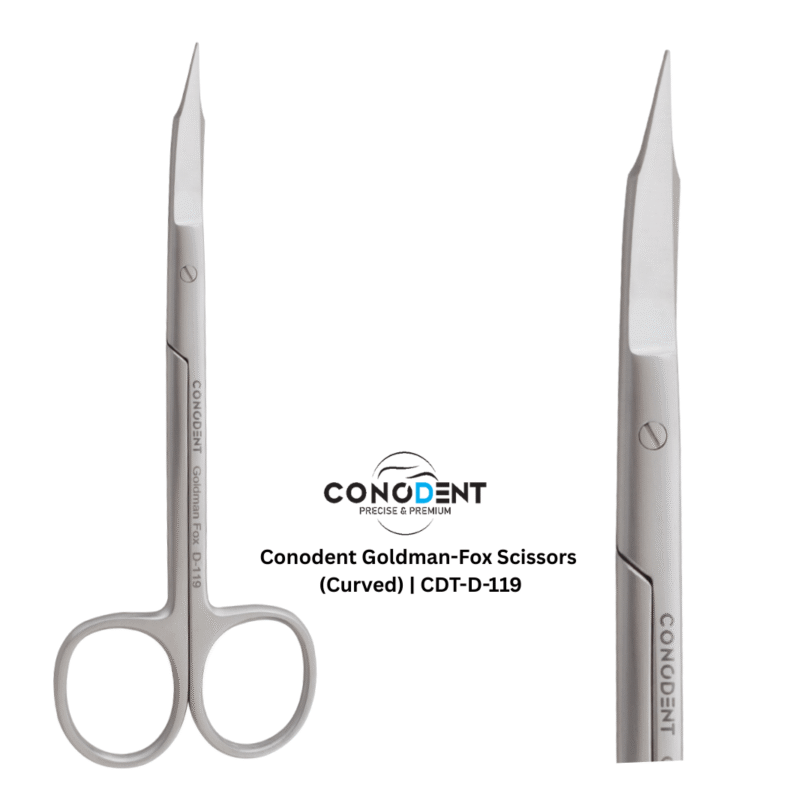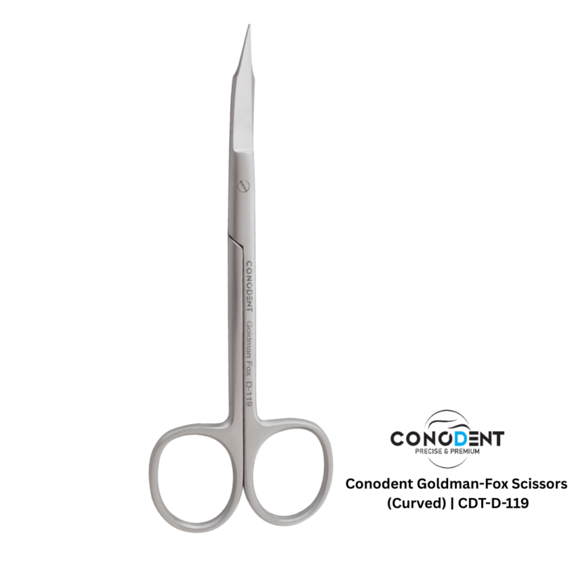 The CONODENT Goldman-Fox Scissor (Curved), product code CDT-D-119, is a premium-grade surgical instrument designed for precision and durability in dental and periodontal procedures. Engineered for fine tissue contouring and gingivectomy, these scissors offer superior control and clean cutting performance.