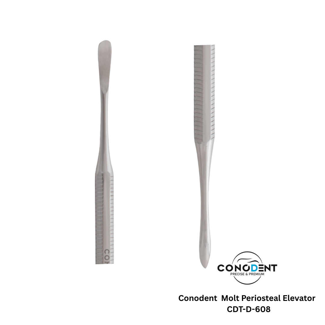 The CONODENT Molt Periosteal Elevator (CDT-D-608) is a versatile and essential surgical instrument designed for the efficient reflection and retraction of the mucoperiosteum. A staple in oral surgery, the Molt design is preferred by clinicians for its ability to handle both delicate tissue separation and more robust flap elevation with ease.
