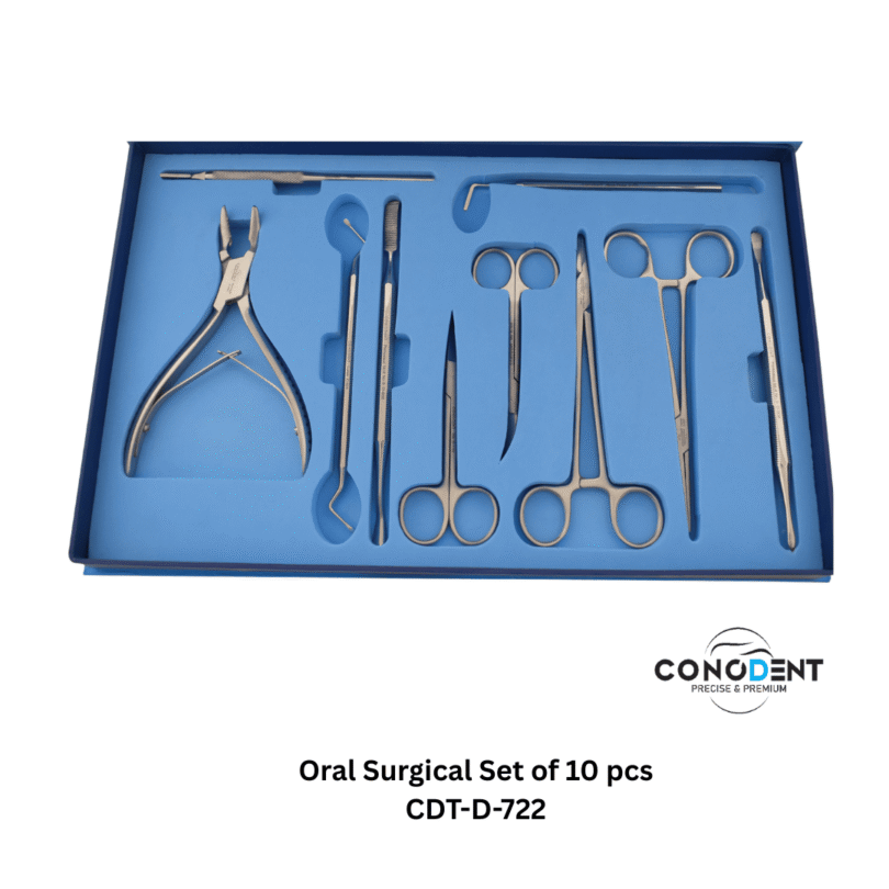 • Components: Includes essential scalpel handles, periosteal elevators, bone files, curettes, needle holders, and surgical scissors.