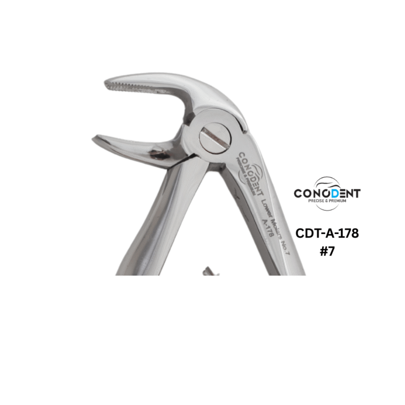 The Conodent Klein Figure 7 Extraction Forceps are engineered for the retrieval of primary (deciduous) lower roots and fragments. These forceps feature the narrowest beak profile in the Klein lower arch series, providing the precision required to engage small, submerged root surfaces without trauma to the surrounding tissue.