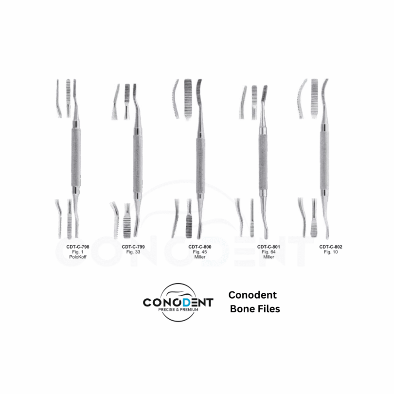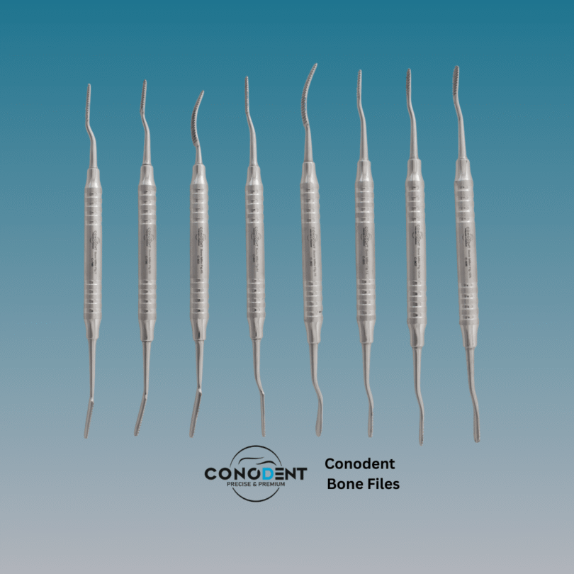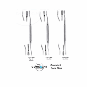 The CONODENT Premium Bone File range is engineered for the final smoothing and shaping of bone following extractions or during alveoloplasty. These instruments are essential for removing sharp spicules or “bone spurs” that could cause patient discomfort under a prosthesis or interfere with soft tissue healing. Featuring a specialized 10mm Hollow Handle, these files offer unparalleled tactile sensitivity and ergonomic comfort.