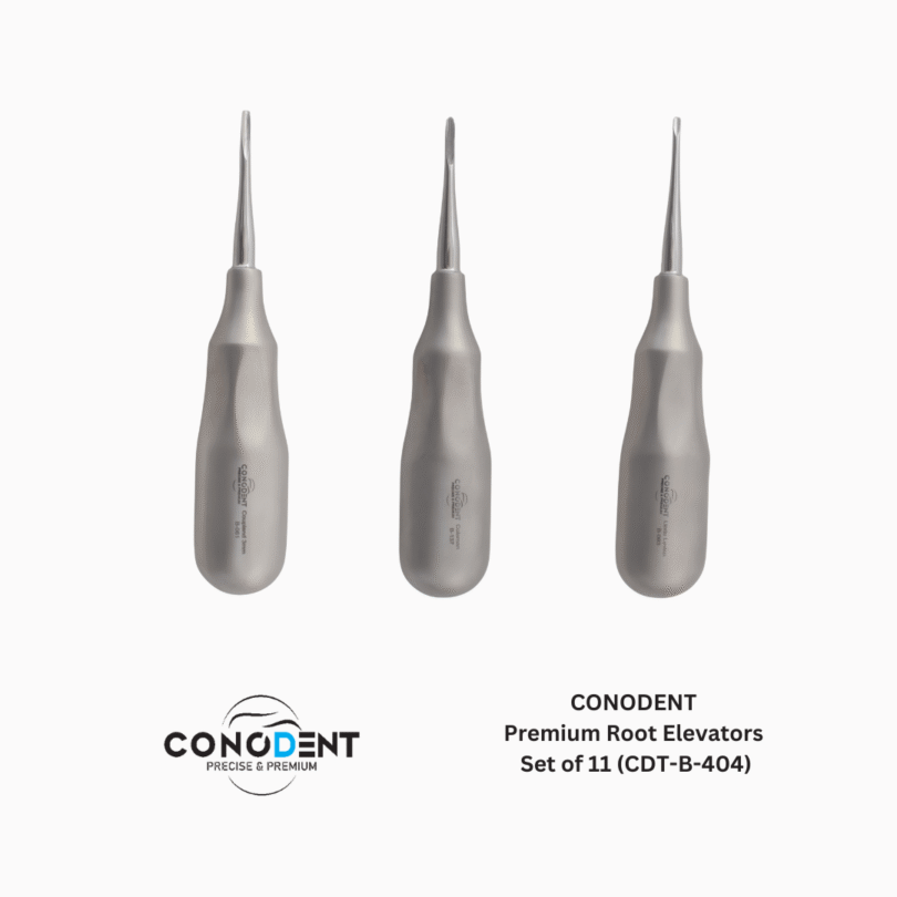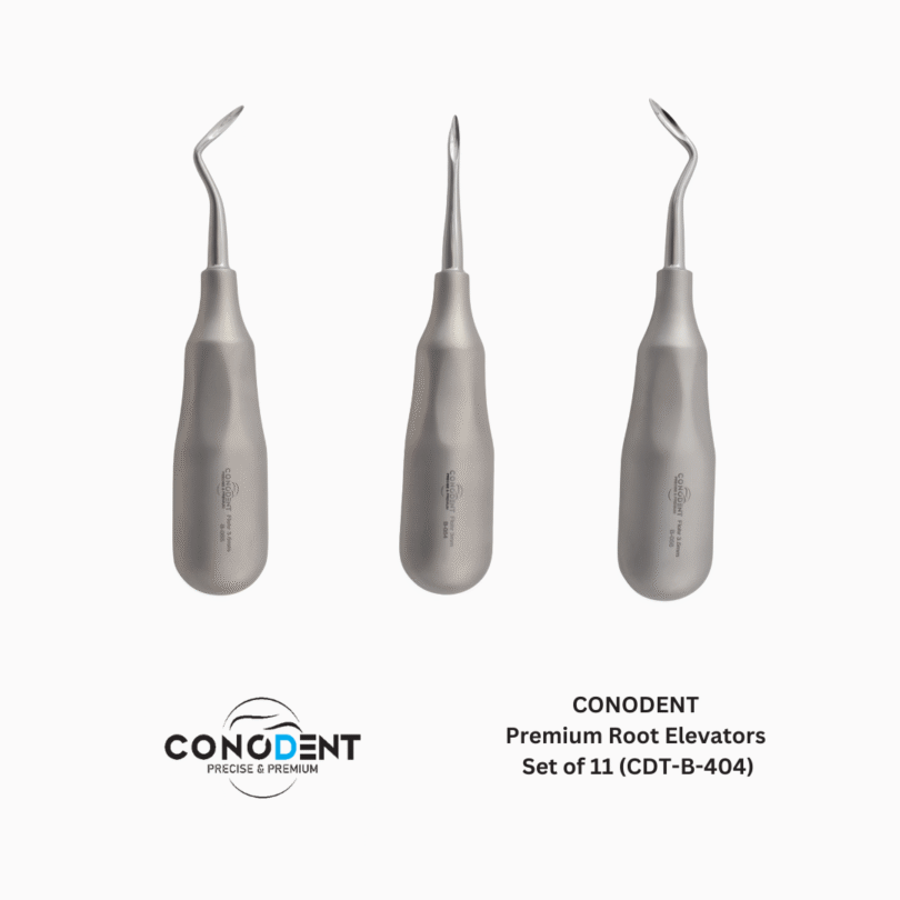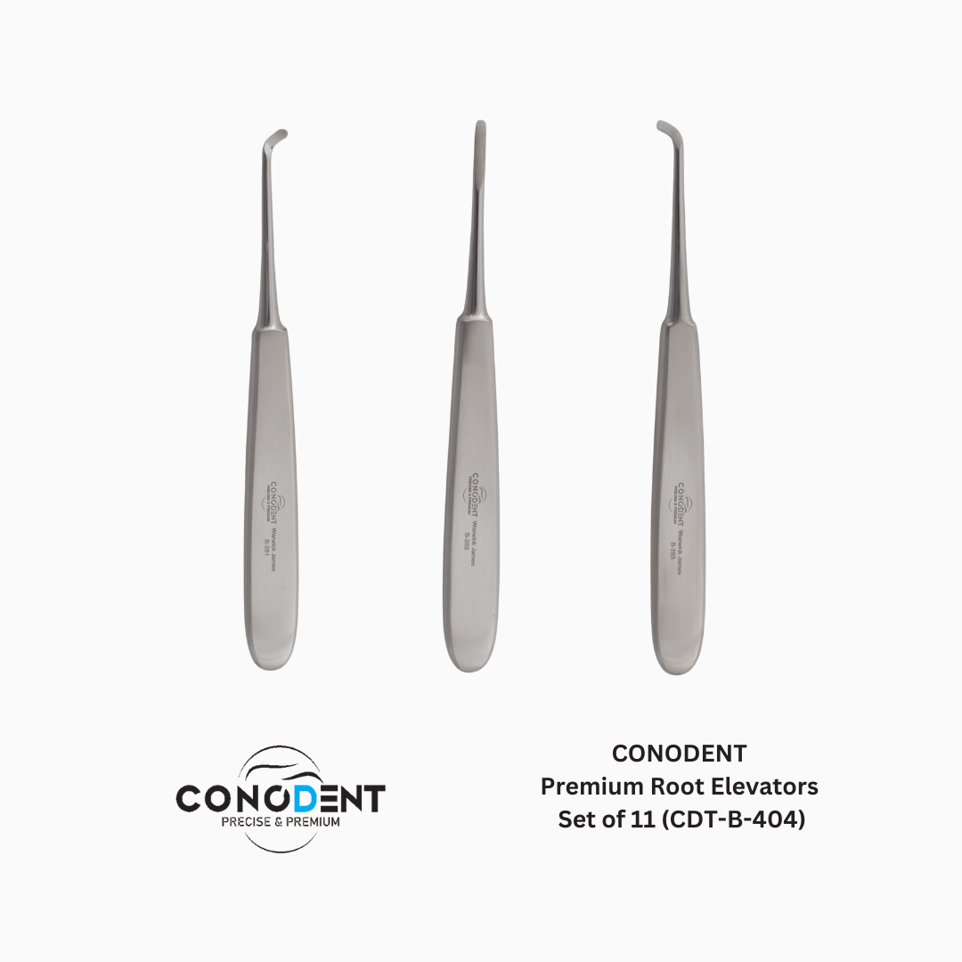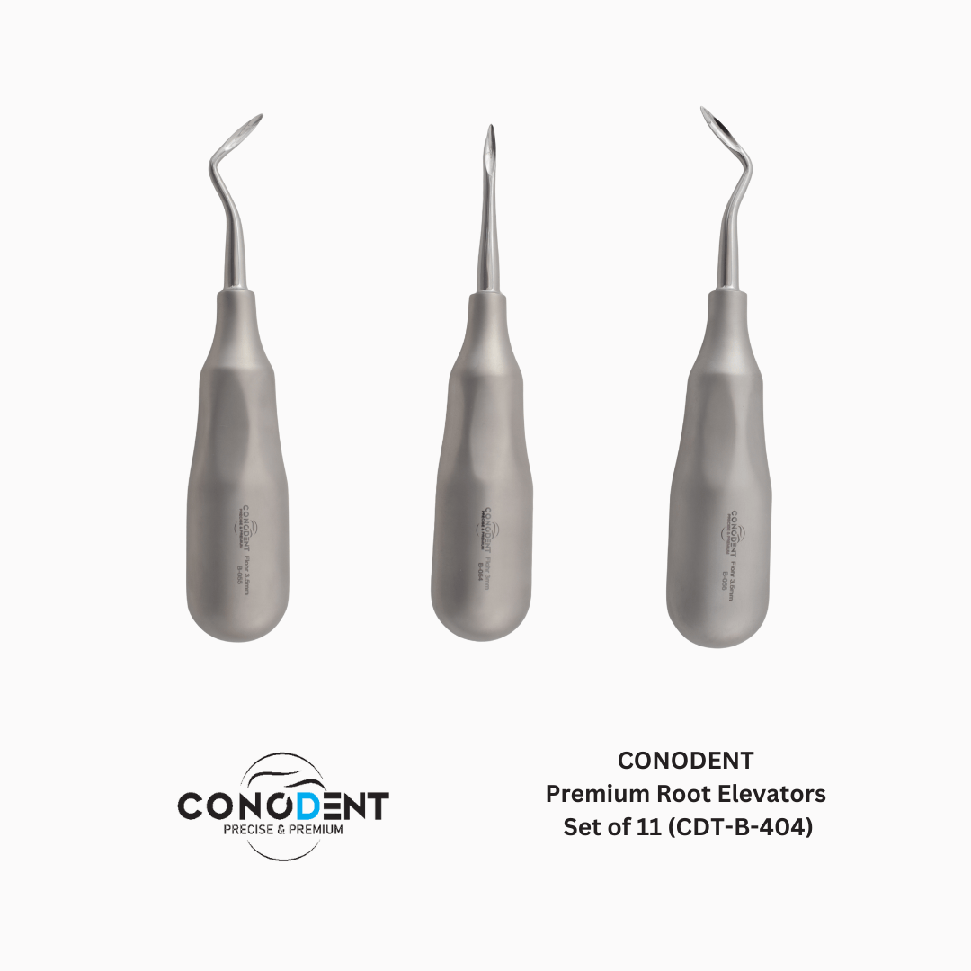 The CONODENT CDT-B-404 is a comprehensive, 11-piece elevator system designed for the sophisticated oral surgeon. This set moves beyond traditional heavy instrumentation by featuring a High-Volume Ergonomic Handle that is hollow-core and lightweight. The unique Sand Finish provides a micro-textured, non-slip surface that ensures maximum grip stability and eliminates glare, even under the most intense operatory lighting.