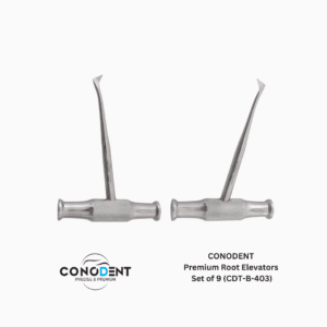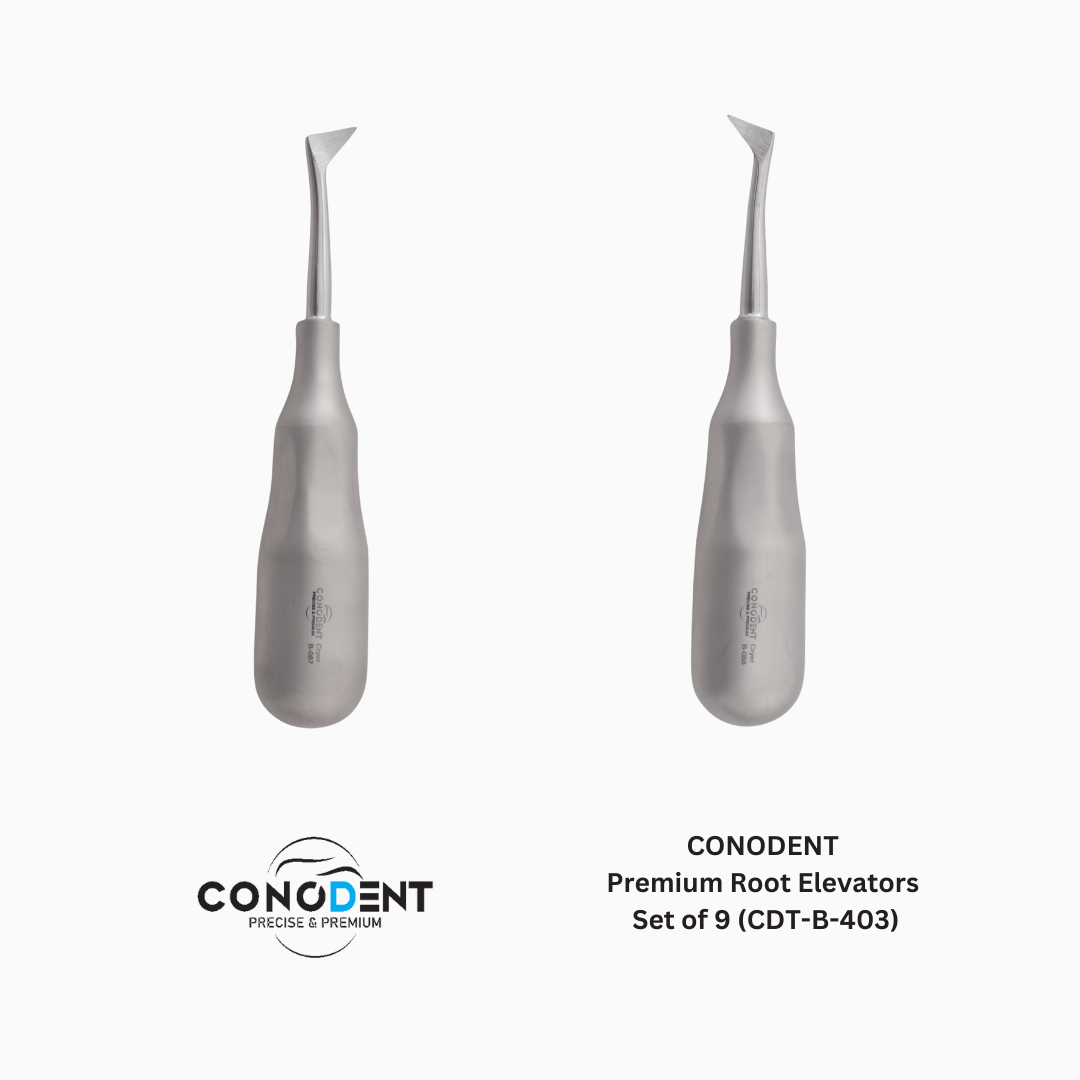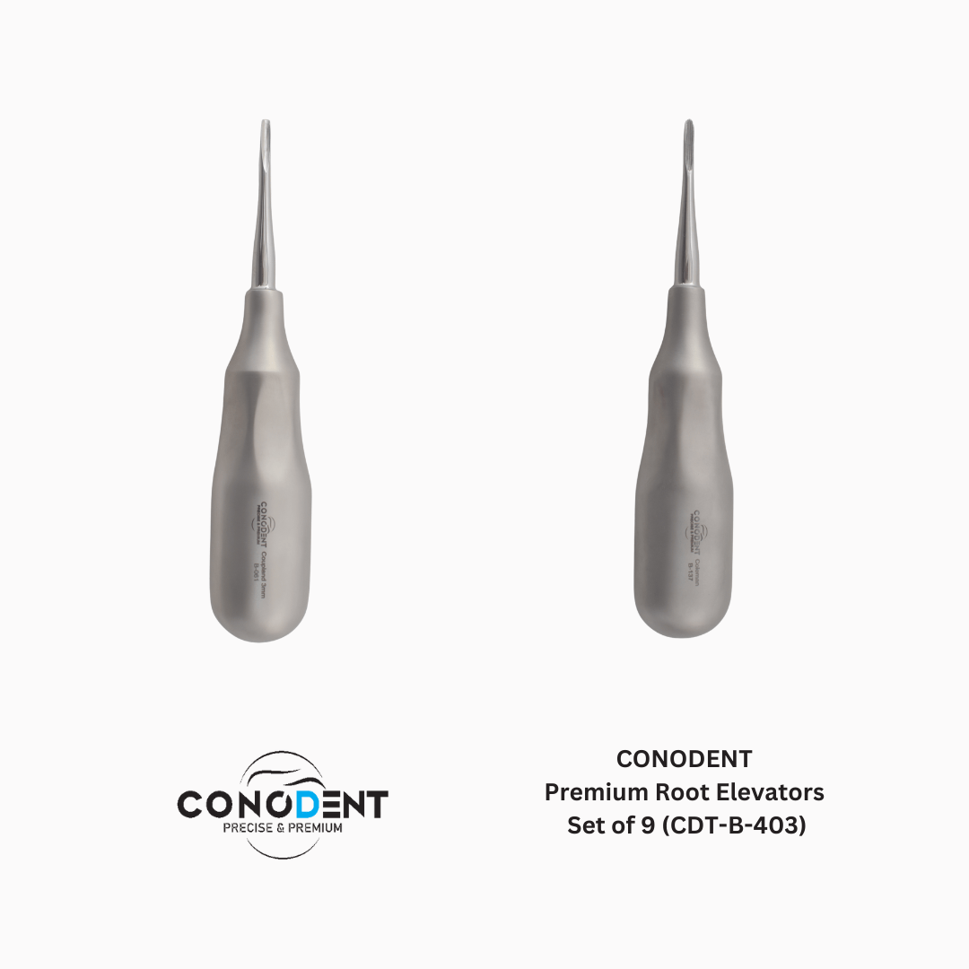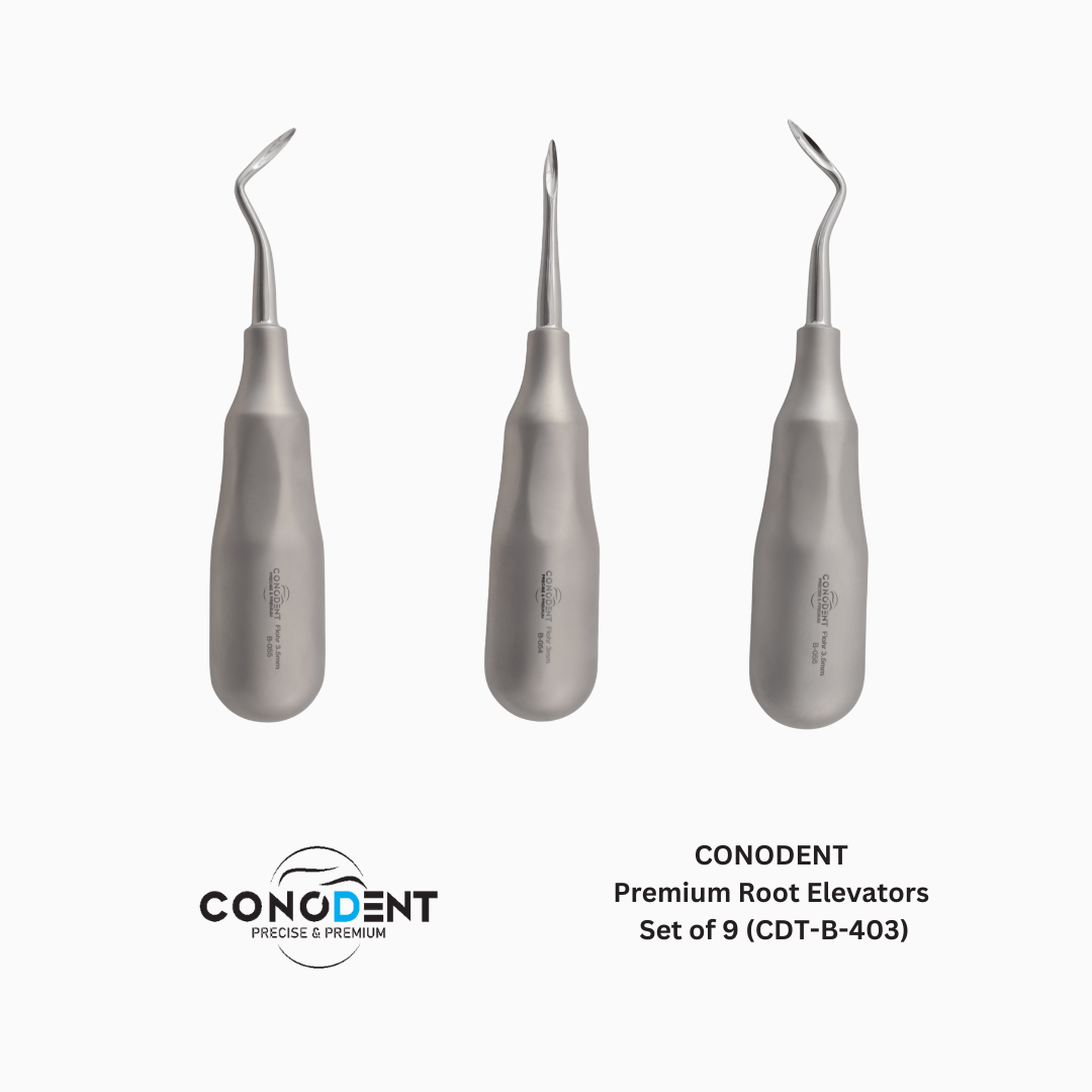 The CONODENT CDT-B-403 is a precision-engineered set of 9 elevators designed for clinicians who require maximum grip control and reduced hand fatigue. Forged from high-tempered, medical-grade stainless steel, these instruments feature a specialized Sand Finish. This micro-textured surface provides a superior non-slip grip—even when wearing wet gloves—and eliminates distracting light reflections during surgery.