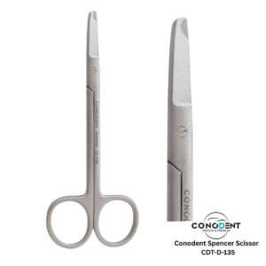 The CONODENT Spencer Scissors (Product Code: CDT-D-135) are premium-grade dental instruments specifically designed for the precise removal of sutures. Featuring a distinctive small hook on one blade, these scissors allow for effortless lifting of the suture material before cutting, ensuring minimal discomfort for the patient and maximum control for the clinician.